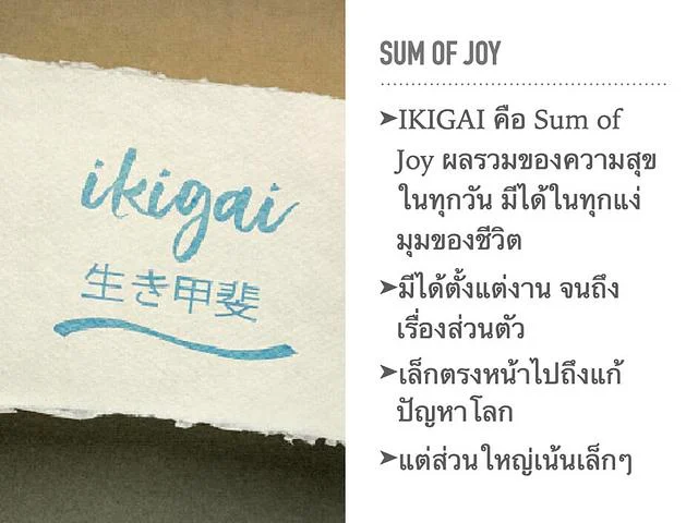 จากนั้นนำสู่บทเรียนด้วยการแชร์ความหมายของ IKIGAI
