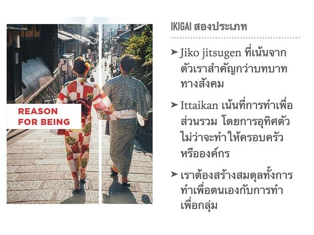 แต่ก็จะมีการอ้างอิงถึง Research เกี่ยวกับ IKIGAI ของ Gordon Matthew ว่า Ikigai มีได้ทั้งแบบเอาตัวเองเป็นศูนย์กลางกับสังคมเป็นศูนย์กลาง หลักคิดคือได้ทั้งคู่ สร้างสมดุลย์ให้ดี