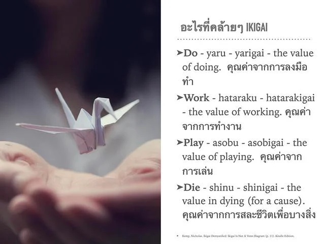 การศึกษาเรื่อง IKIGAI นี่ค่อนข้างเป็นปรัชญาไม่ง่ายนัก ผมเป็นอาจารย์ MBA ผมเน้นเอามาพัฒนาชีวิตตัวเราเองให้มีความสุขในการทำงาน สร้างอาชีพที่เป็นตัวตนเราจริงๆ แต่จริงๆ เท่าที่ศึกษา IKIGAI มีได้ในทุกมิติของชีวิต
