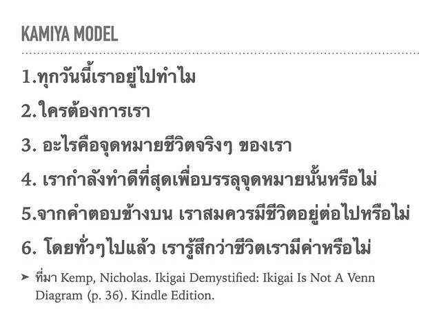 สำหรับผมเป็น IKIGAI ที่ทำให้เราไม่มองแต่ตัวเอง ใช้ในการหาภาพใหญ่ๆในชีวิต และเชื่อมโยงตัวเองกับผู้อื่น แต่ไม่แนะนำสำหรับคนเป็นซึมเศร้า เพราะโตมาจากสายการบำบัด (อันนี้ผมคิดเอง)