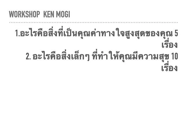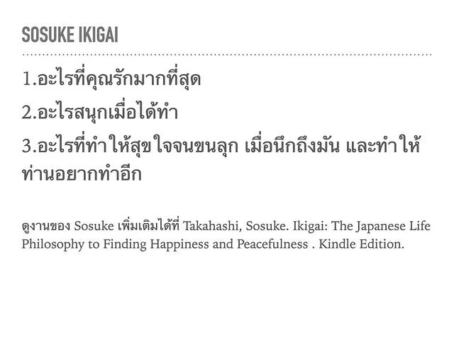 ผมสอน IKIGAI มาหลายปี วันนี้อยากมาสรุปว่าล่าสุดผมสอน IKIGAI อย่างไร เนื้อหาเรียง sequence อย่างไร เพื่อให้คนไปต่อยอดต่อ โดยเน้นว่าเนื้อหาและกระบวนการนี้ผมขอสงวนลิขสิทธิ์ทุกประการ ห้ามทำเป็นการค้า