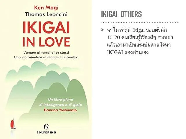Ken Mogi ยังแนะนำว่าการหา IKIGAI เราอาจจะไปดูของคนอื่นแล้วปรับมาปรับไปจนเป็นของเรา นำทมาสู่ชุดคำถามอีกชุด แต่แนะนำว่าอาจให้เวลาสัก 2-3 อาทิตย์แล้วกลับมาคุยกันอีกครั้ง