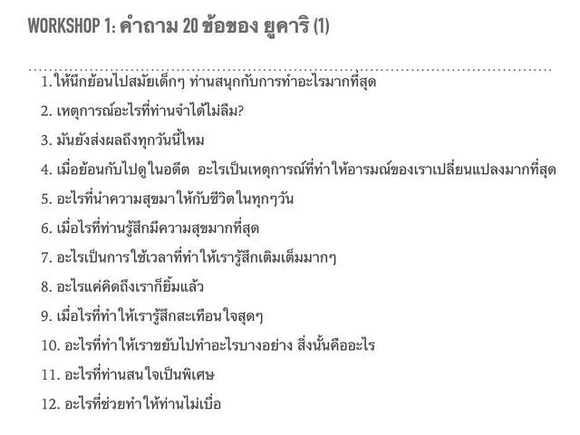 ในส่วนตัวผม ผมจะเริ่มจากการการใช้คำถาม ผมจะให้ผู้เข้าเรียนไม่ว่าจะเป็น Workshop หรือการโค้ชตอบที่จะชุดคำถาม เหมือนพาเขาเก็บข้อมูลตัวเอง แล้วค่อยเอาข้อมูลไปใช้ต่อ เช่นจัดระบบชีวิต การพัฒนา Hobby งานจิตอาสา หรือแม้กระทั่งธุรกิจ