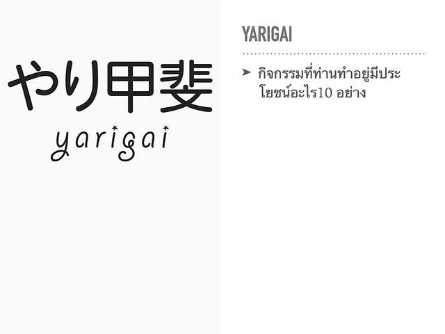 มาเรื่อง Yarigai ตัวนี้ใช้สำหรับหาคุณค่าของสิ่งที่ทำอยู่เช่นถ้าคุณเบื่อทำบัญชีครัวเรือน คุณลองเขียนประโยชน์ของมันออกมา 10 อย่างคุณจะเห็นคุณค่าอะไรบางอย่างแล้วพลิกกลับมาชอบได้ ผมมักใช้ช่วยคนที่กำลังเบื่อทำสิ่งที่ไม่อยากทำมามาก