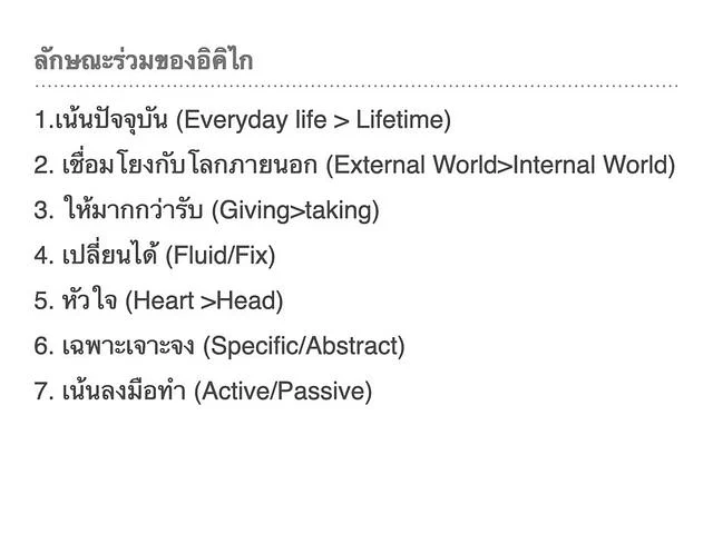 เมื่อจบแล้วควรสอนอย่างอื่นไปด้วยนั่นคือวัฒนธรรมญี่ปุ่น ที่ในมุมมองผมถ้าไม่พูด ผมว่าไม่มีทางเข้าใจ ในหนังสือ IKIGAI หลายๆ เล่มจะพูดถึงเรื่อง Ichigo Ichie, Wabi Sabi, Kodawari, Kaizen, Zen, Yarigai, Hatarakigai และ Taoism และอื่นๆ แต่ไม่ปรากฏในอิคิไก แต่ดูคล้ายคลึงกันได้แก่ Kinsugi, Omotenashi และ Omoiyari ผมอ่านมาแล้วใช้ชุดคำถามที่ออกแบบมาถามคนในวงให้แชร์ออกมา จะทำให้เราสัมผัสเรื่องต่างๆที่พูดมาได้เอง เวลากลับไปอ่านค้นคว้าจะเข้าใจมากกว่าเดิม ที่สำคัญทำให้อินกับ IKIGAI มากขึ้น